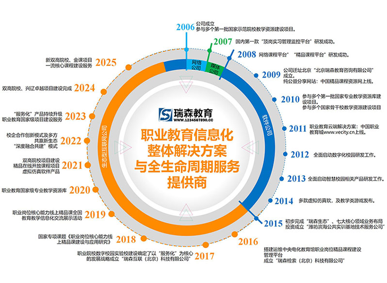 瑞森教育始创于2006年,业务覆盖全国,是专注于教育信息化整体解决方案与全生命周期服务的生态型互联网公司。旗下公司包括瑞森教育研究院、北京瑞森教育咨询有限公司、瑞森检索(北京)科技有限公司、瑞森互联(北京)科技有限公司,并参股成立潍坊滨海公共实训基地技术服务有限公司。公司致力于打造"研究咨询+规划建设+平台运维+托管服务"四位一体的教育信息化全生命周期服务体系,目前已完成智慧校园、教学资源、实习实训、技能比赛、数字教材、师资培训、职教云端七大核心业务的教育信息化全产业链布局。